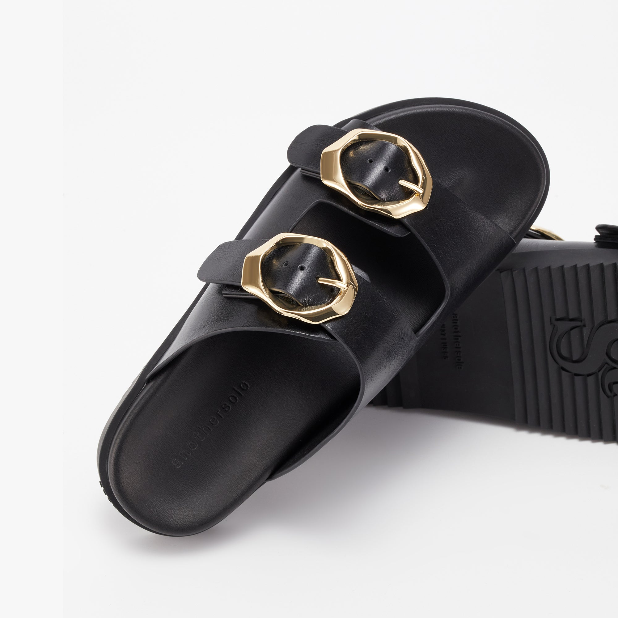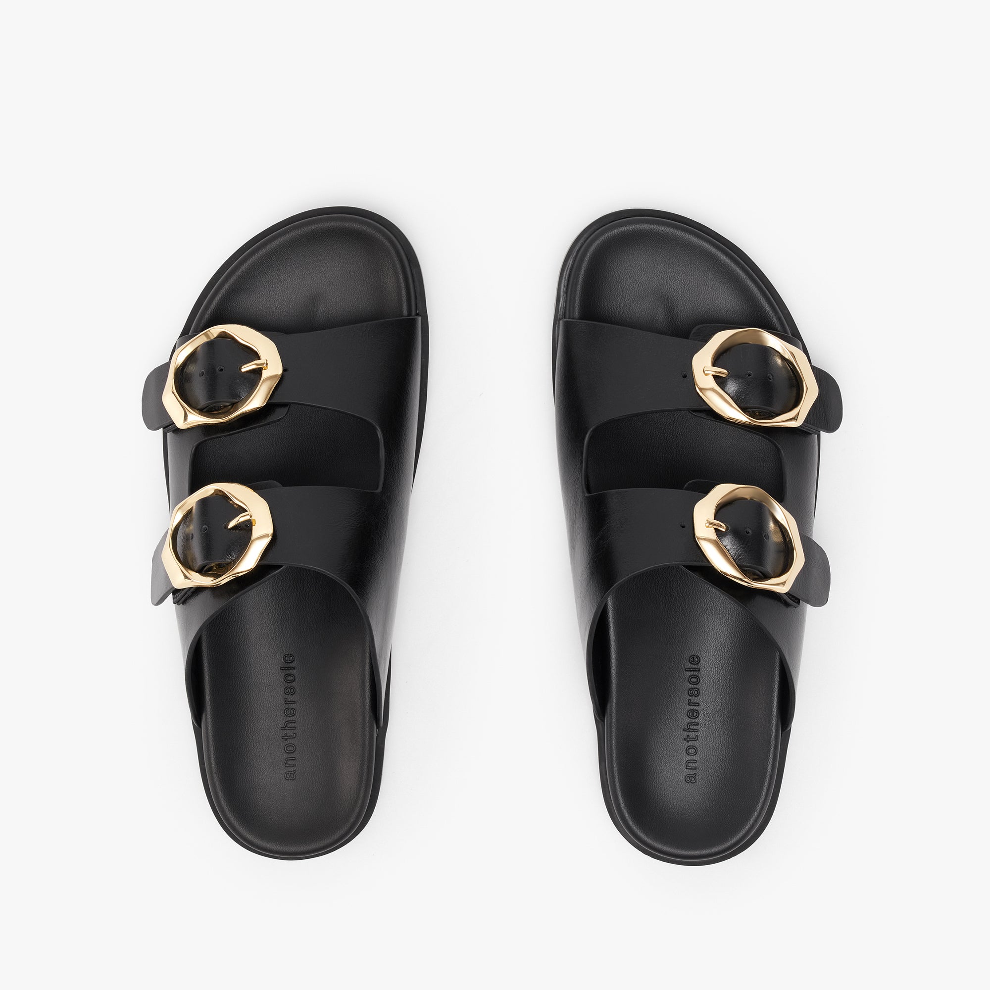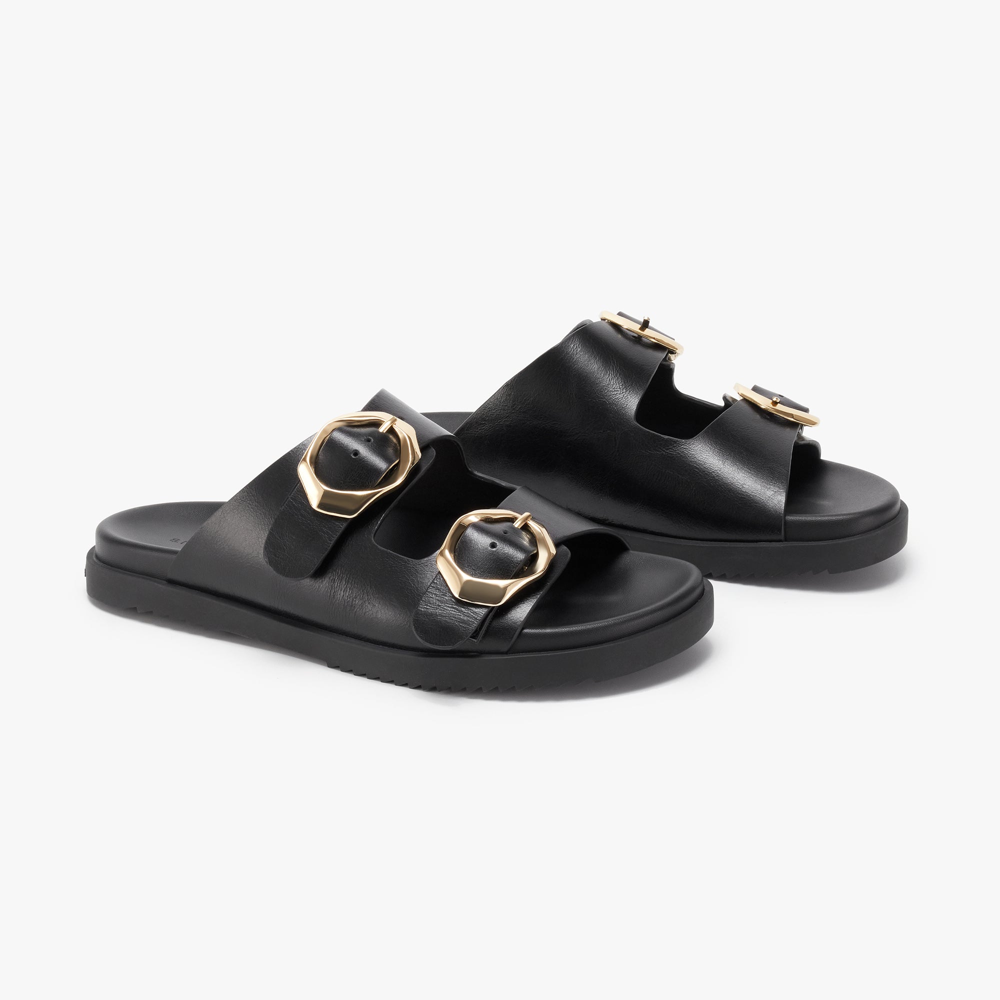 • E07F840D-0C32-44EC-AC03-99400EC76B6A Created with sketchtool. Leather upper with statement double buckles and marshmallow cushion footbed.
