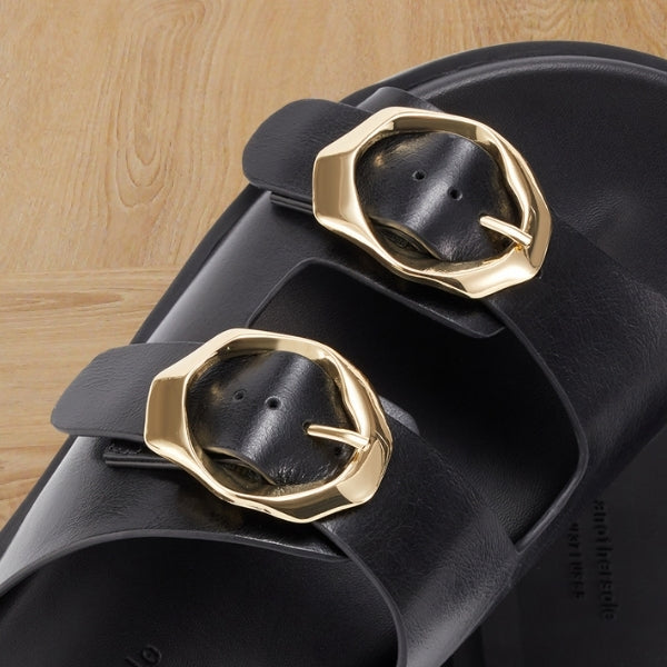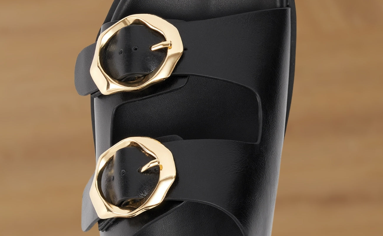 A structured slide featuring oversized hardware that brings strong visual impact. The silhouette feels modern, confident, and effortlessly chic. Built for bold styling without sacrificing comfort.