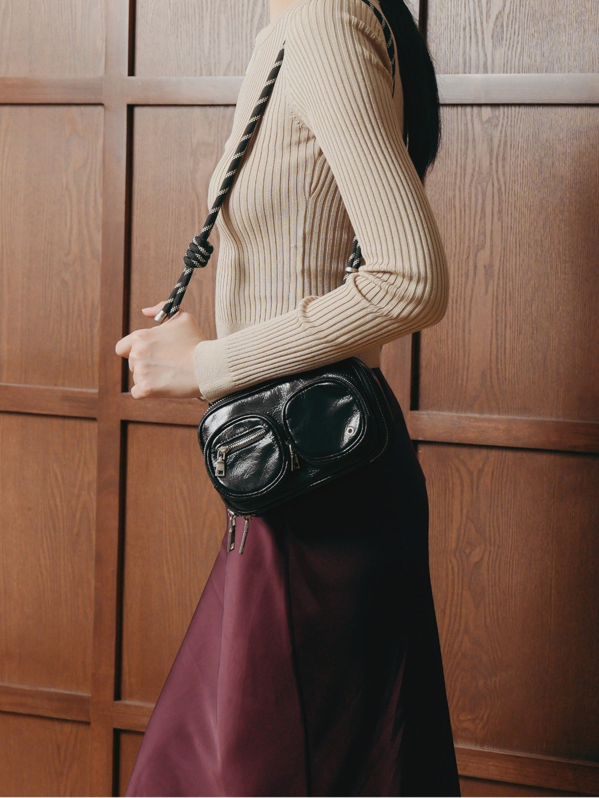 • 431C1BE3-2884-4994-9D4E-E96E091346AE Created with sketchtool. A patent finish brings quiet shine, while smart pockets keep everything within reach.