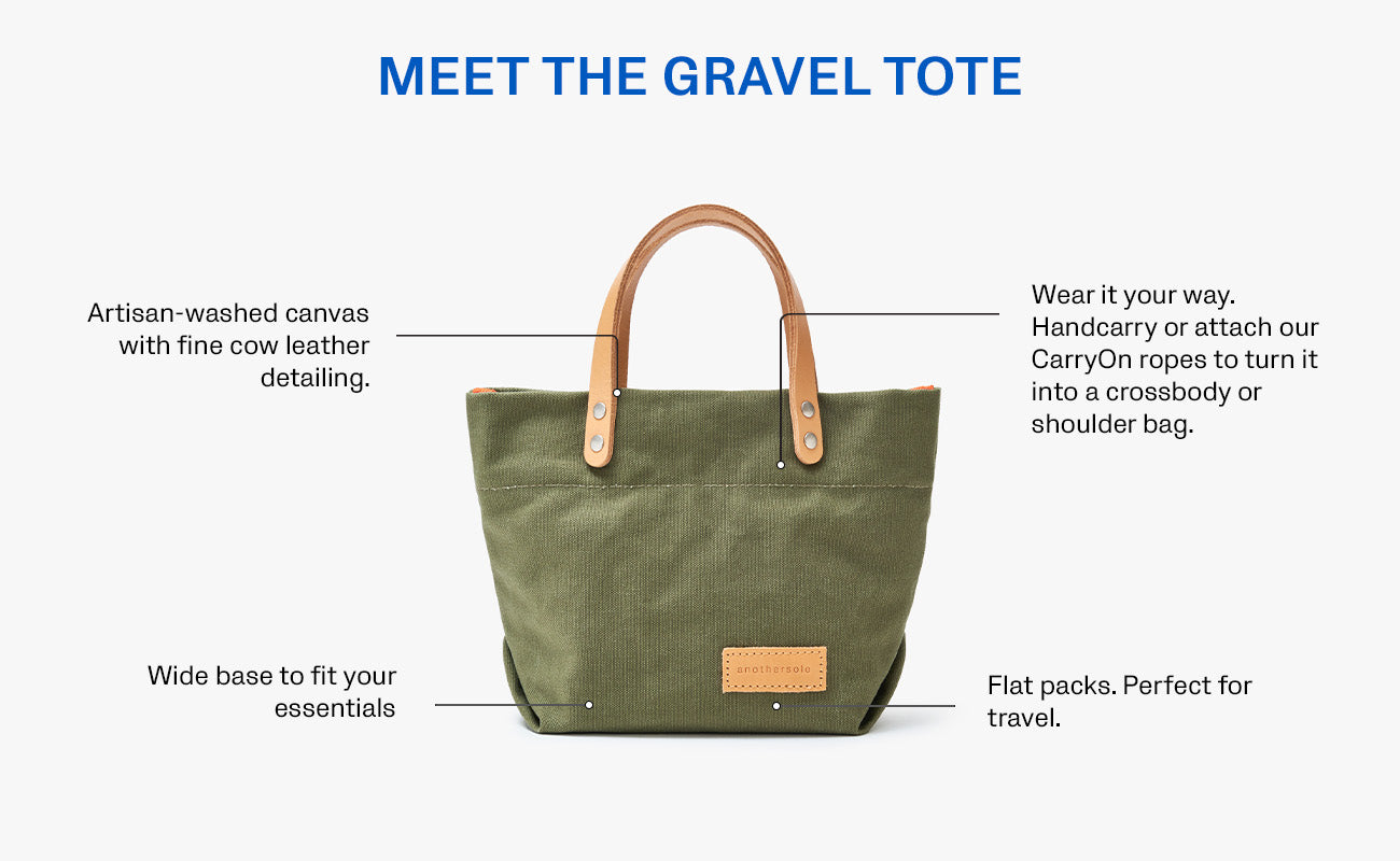 • 431C1BE3-2884-4994-9D4E-E96E091346AE Created with sketchtool. Carry On Your Way: The Gravel Tote. The Gravel Tote blends rugged style with everyday ease. Made with quality washed canvas and natural leather, it's designed to hold your essentials and adapt to your life. Personalize with a Carry On sling and make it uniquely yours.