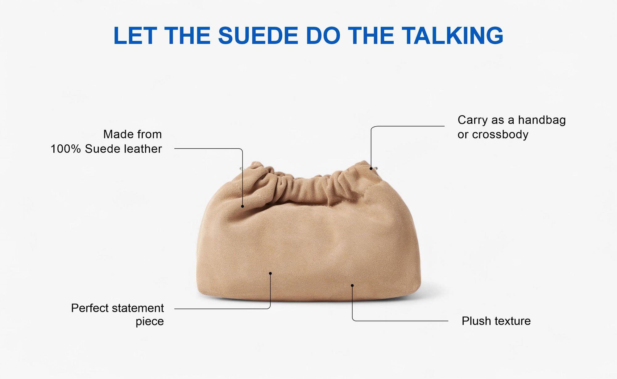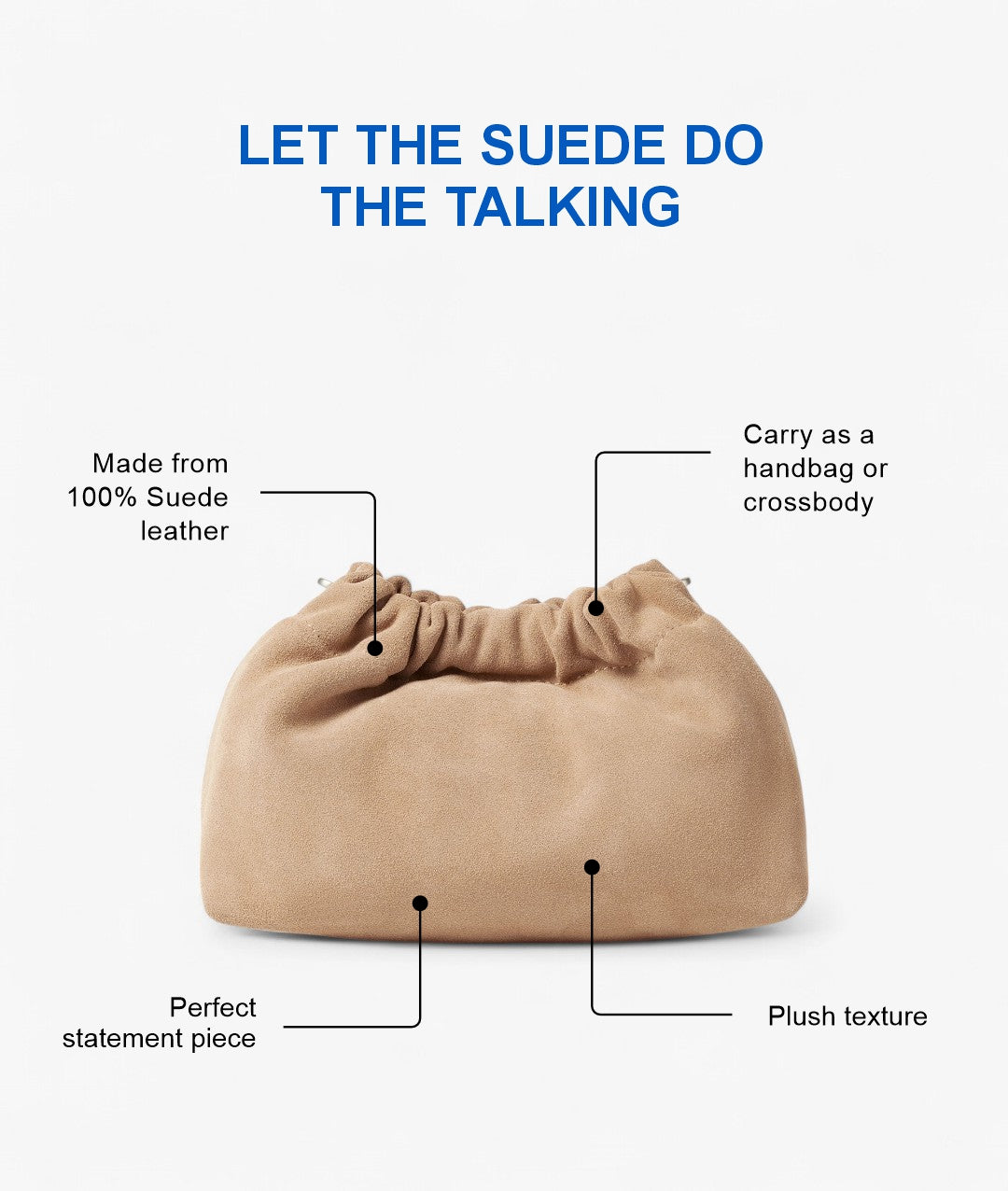 • 431C1BE3-2884-4994-9D4E-E96E091346AE Created with sketchtool. Designed to move with you and match your mood—Baozi is soft, sculptural, and made to stand out. Crafted from 100% suede leather with a gathered silhouette, it brings effortless glamour to any look, from dressy days to sparkling nights. Its plush texture adds instant polish, while the option to personalise with our 8MM sling ropes lets you wear it your way. Carry it solo for maximum impact or style it crossbody when life picks up the pace. With Baozi, style always follows your lead.