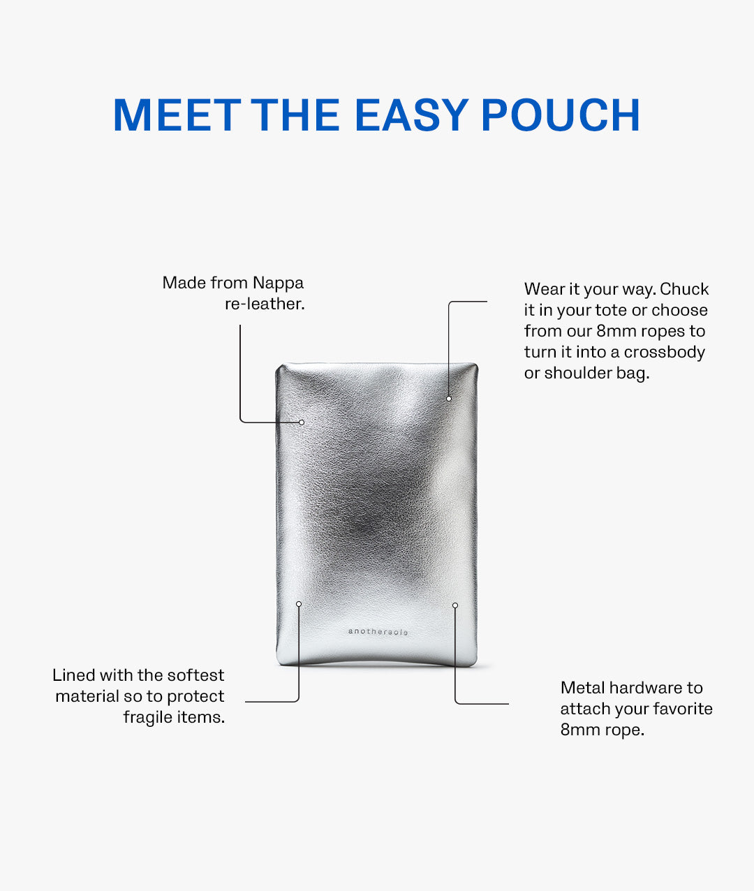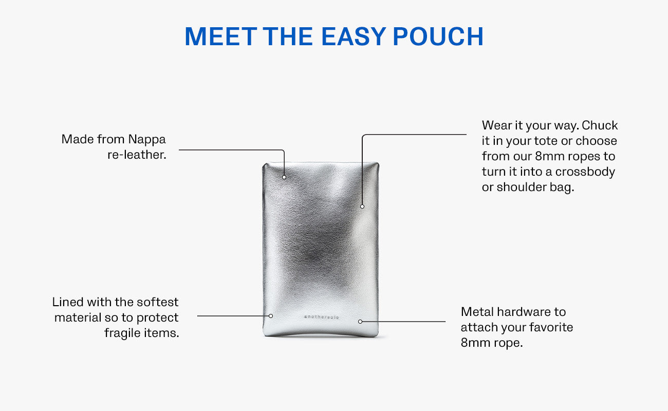 - Introducing the Easy Pouch- the perfect accessory to store your mobile phone and small essentials, designed for hassle-free errands and on-the-go moments. Pair it with an 8mm sling rope or keep it inside your tote. Available in classic colors to match any look.