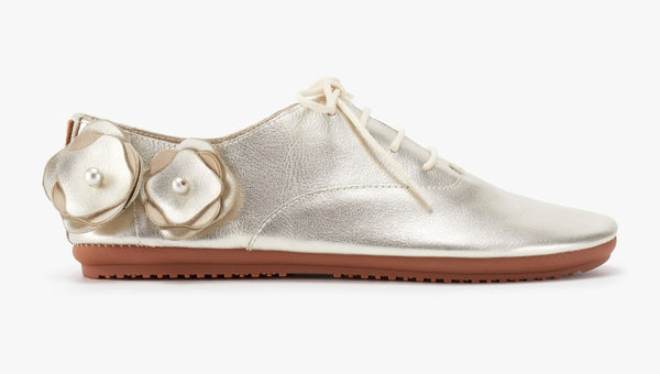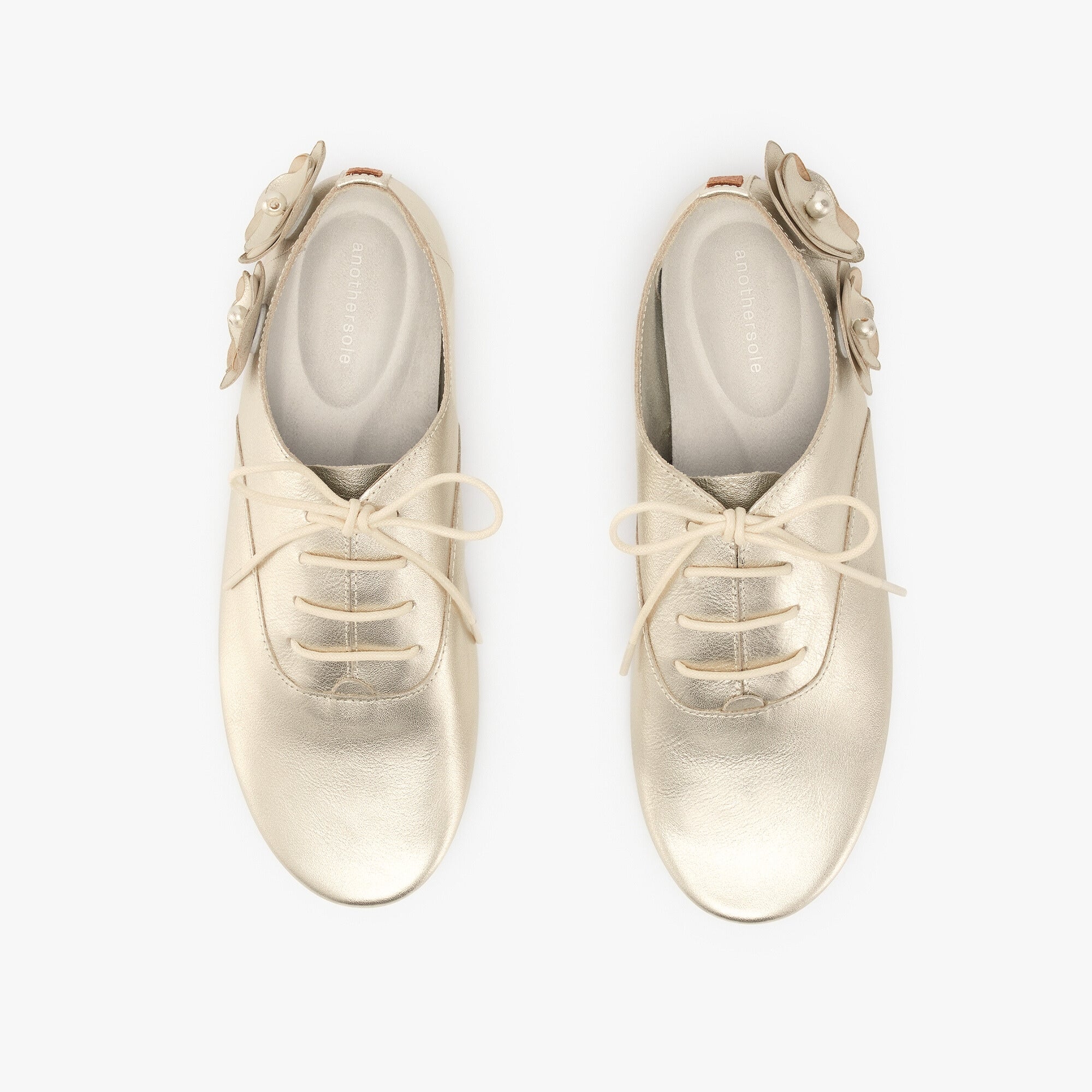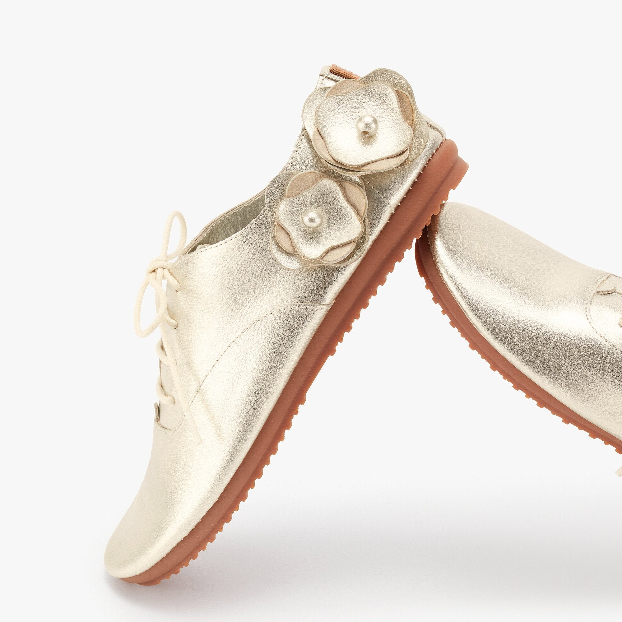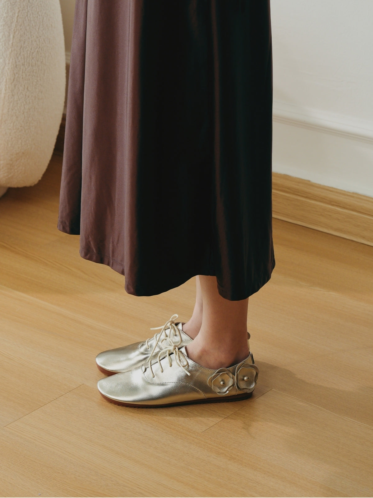 A feminine lace-up flat highlighted by a delicate handcrafted leather corsage. The metallic finish adds gentle glow without overwhelming the aesthetic. A limited-edition piece designed to stand out softly.