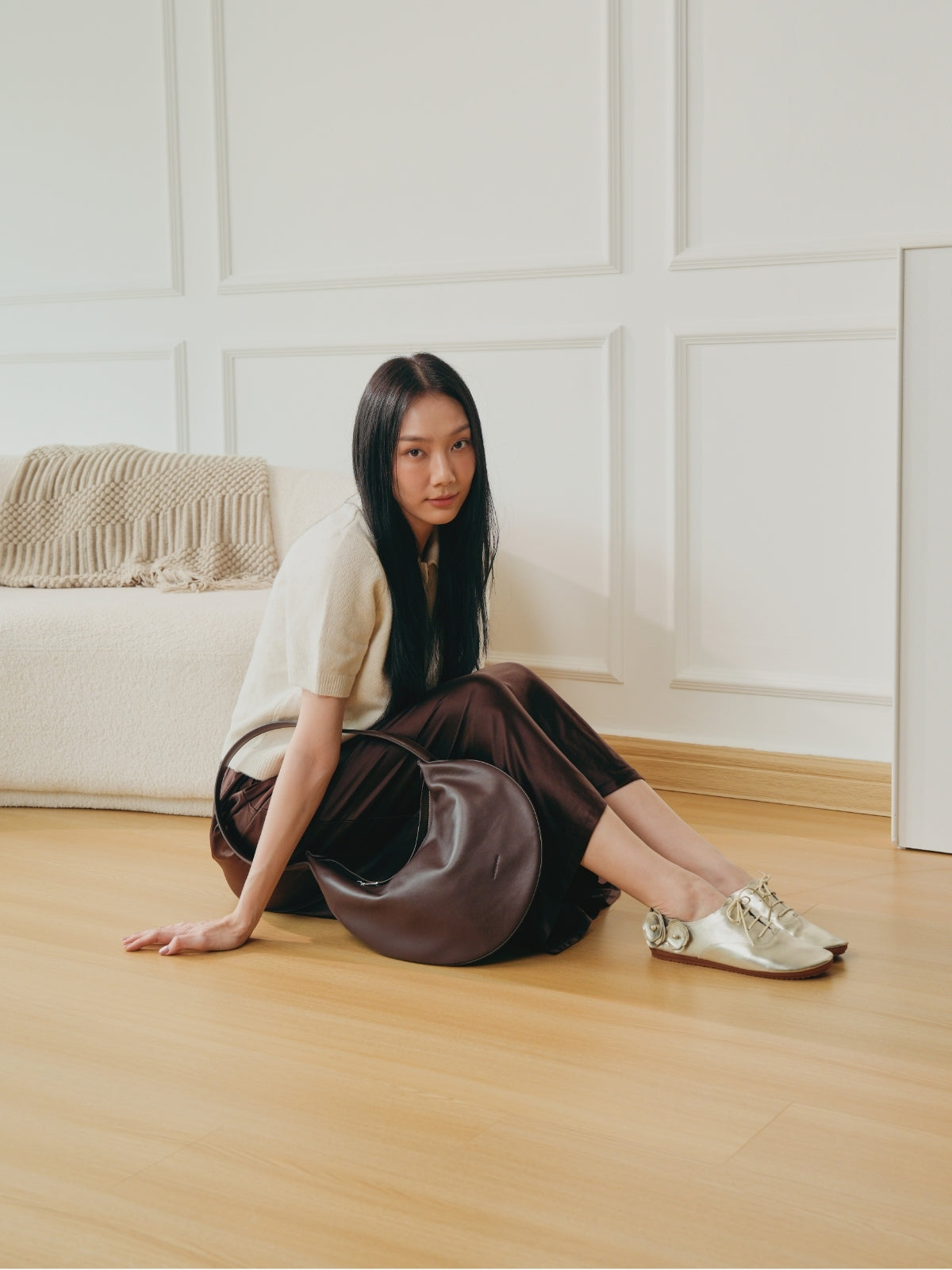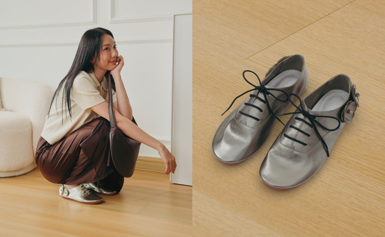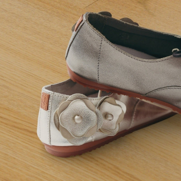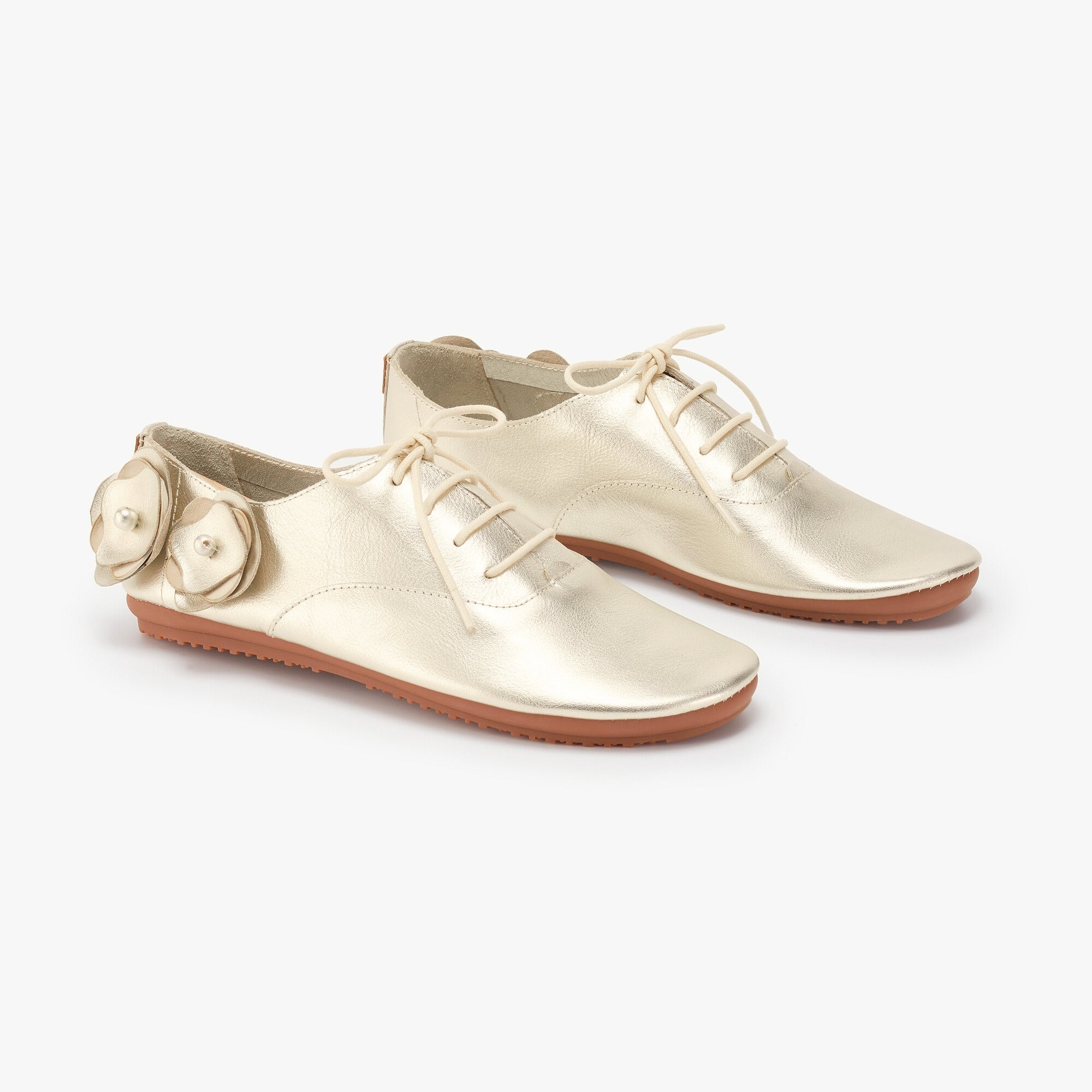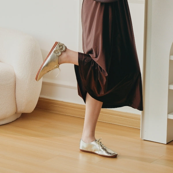 A feminine lace-up flat highlighted by a delicate handcrafted leather corsage. The metallic finish adds gentle glow without overwhelming the aesthetic. A limited-edition piece designed to stand out softly.