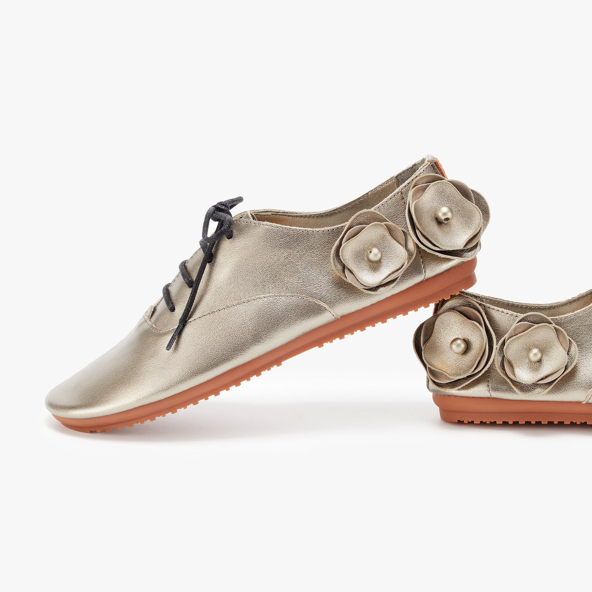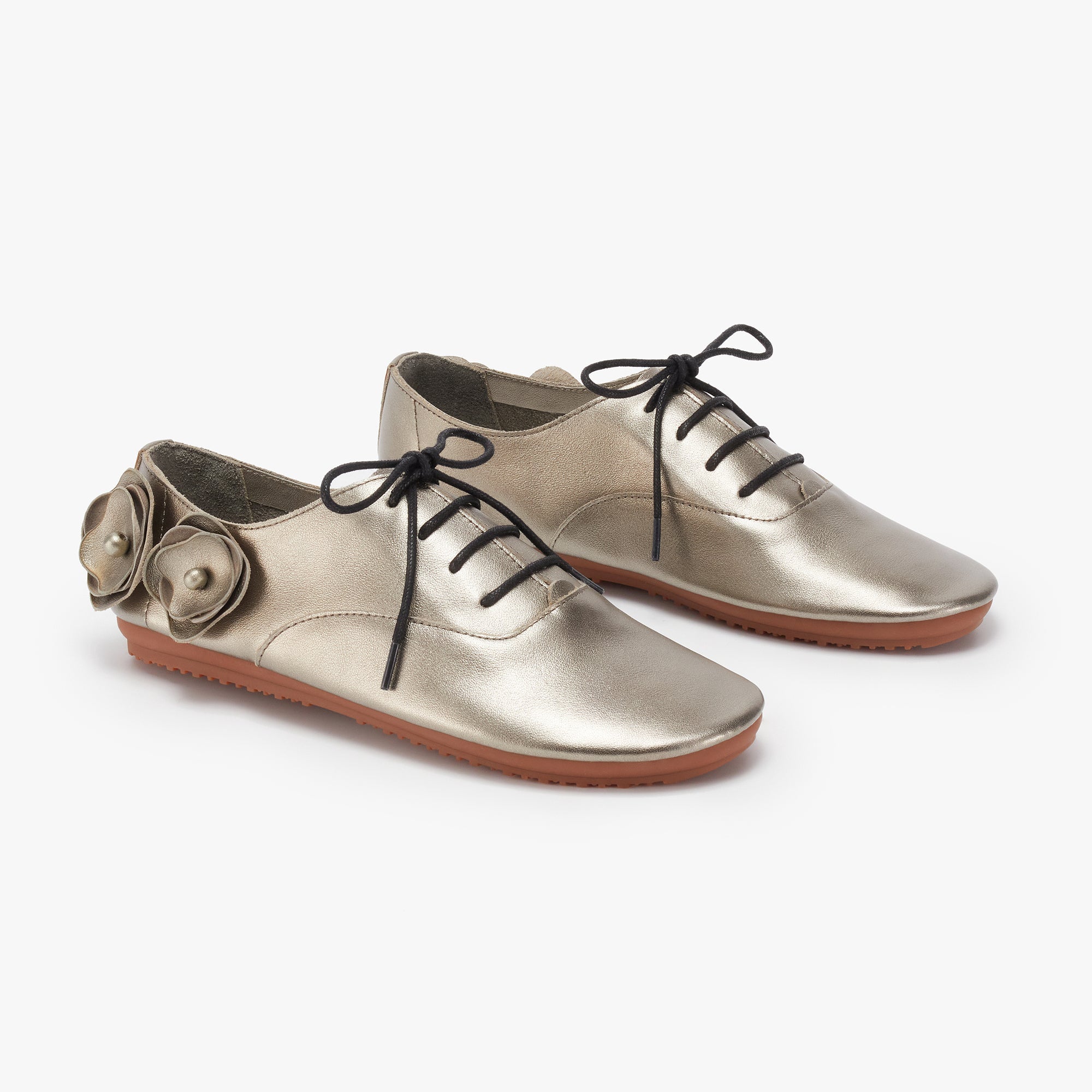 A feminine lace-up flat highlighted by a delicate handcrafted leather corsage. The metallic finish adds gentle glow without overwhelming the aesthetic. A limited-edition piece designed to stand out softly.