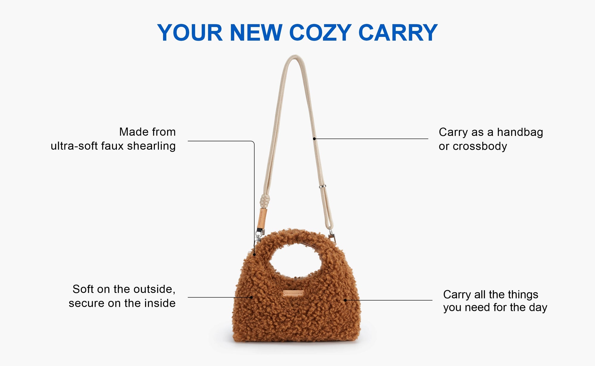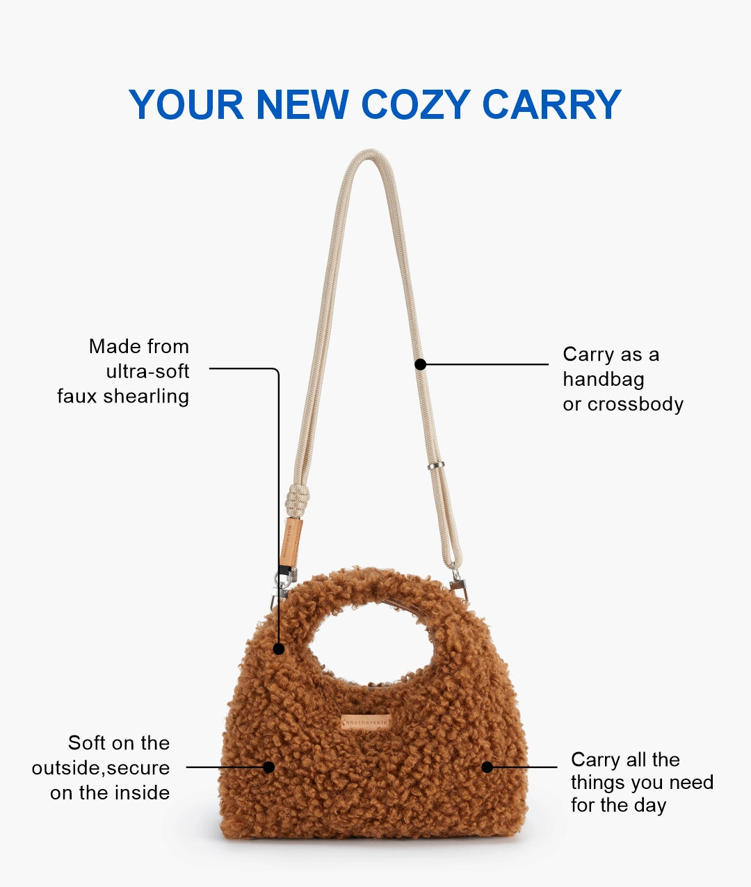 • 431C1BE3-2884-4994-9D4E-E96E091346AE Created with sketchtool. Softly structured, endlessly charming — the Teddy Bag is your cozy companion for the season. Crafted from plush faux shearling, it brings a playful yet polished touch to your everyday look. Compact but practical, it transitions seamlessly from hand-held to crossbody with your favorite CarryOn strap. Perfect for crisp fall days, Teddy holds just what you need — and looks irresistibly cute doing it.