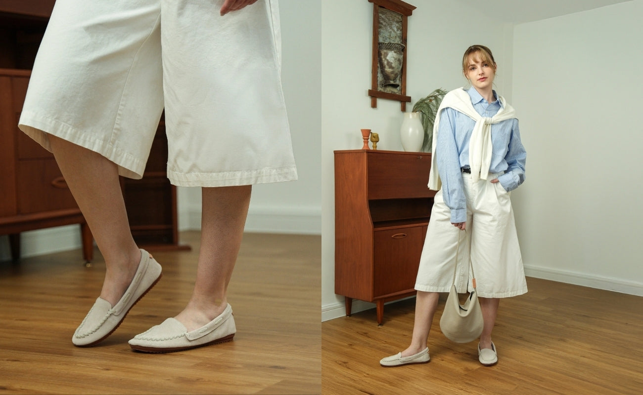 Handstitched soft leathers onto flexible sole provides a glove-like fit, just perfect.